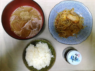 昼食と同様「大根と豚肉の味噌煮込み」と、買ってきたもやしとキムチに、冷蔵庫に残っていた肉を使って豚キムチを作った。